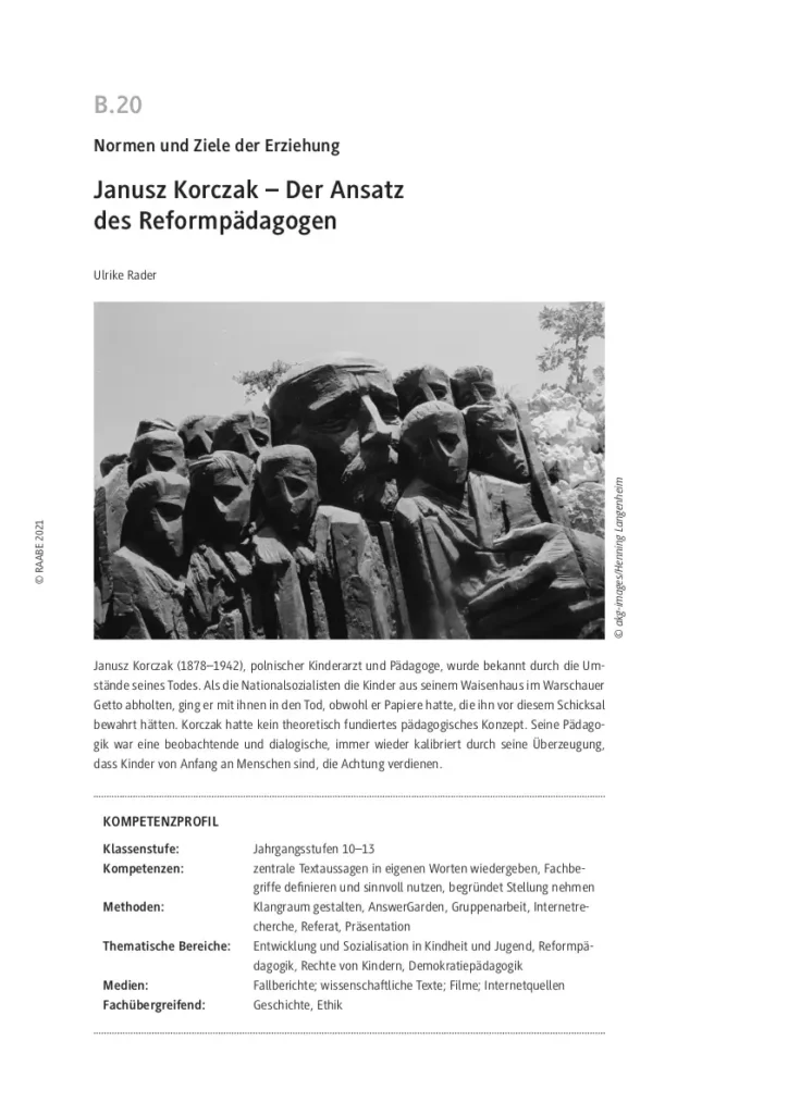 Janusz Korczak (1878–1942), polnischer Kinderarzt und Pädagoge, wurde bekannt durch die Umstände seines Todes. Als die Nationalsozialisten die Kinder aus seinem Waisenhaus im Warschauer Getto abholten, ging er mit ihnen in den Tod, obwohl er Papiere hatte, die ihn vor diesem Schicksal bewahrt hätten. Korczak hatte kein theoretisch fundiertes pädagogisches Konzept. Seine Pädagogik war eine beobachtende und dialogische, immer wieder kalibriert durch seine Überzeugung, dass Kinder von Anfang an Menschen sind, die Achtung verdienen
