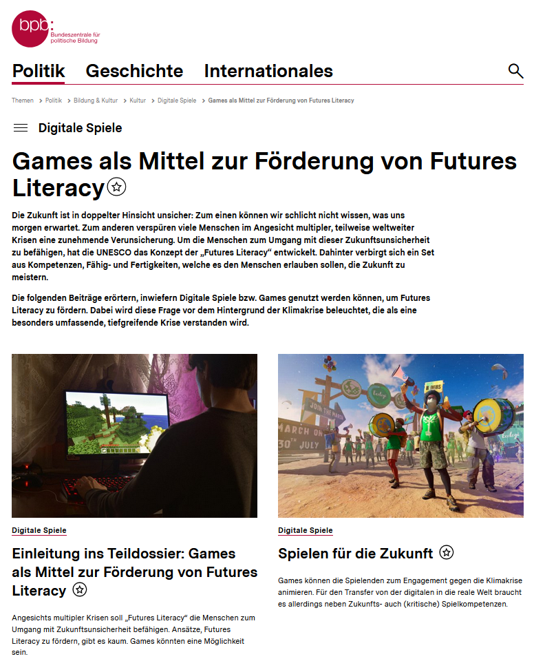 Futures Literacy kann grob mit „Zukunftsalphabetisierung“ übersetzt werden und meint Kompetenzen und Fertigkeiten, die es Menschen ermöglichen, ihre Zukunft (positiv) zu gestalten. Angesichts weltweiter Krisen und Kriege und der damit verbundenen wachsenden Verunsicherung der Menschen, diese zu meistern, hat die UNESCO das Konzept der Futures Literacy entwickelt. In dem Teildossier wird der Beitrag von digitalen Spielen für die Stärkung von Futures Literacy untersucht. In den Texten wird das Verhältnis von digitalen Spielen zur Zukunft und zum Klimaschutz thematisiert, die Beförderung von Leadership-Kompetenz und Resilienz durch Games sowie die Potentiale von digitalen Spielen im Bereich Bildung für Nachhaltige Entwicklung.