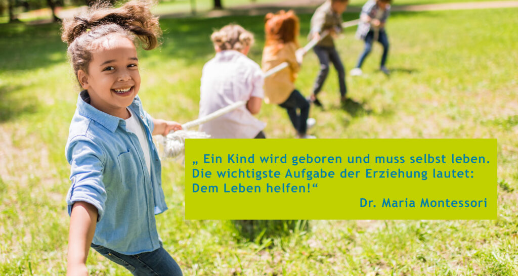 Maria Montessori: „Jede Person ist Mensch und Bürger zugleich.“ Mit ihrer Aussage „Jede Person…“ betont Maria Montessori die Gleichheit aller Menschen – unabhängig von Alters- und Entwicklungsstufen – also vom Neugeborenen bis zum alten Menschen. Und sie verweist auf den unaufhebbaren Doppelcharakter jeder Person: Als individuellen Menschen einerseits und als Mitglied der sozialen Gemeinschaft andererseits.