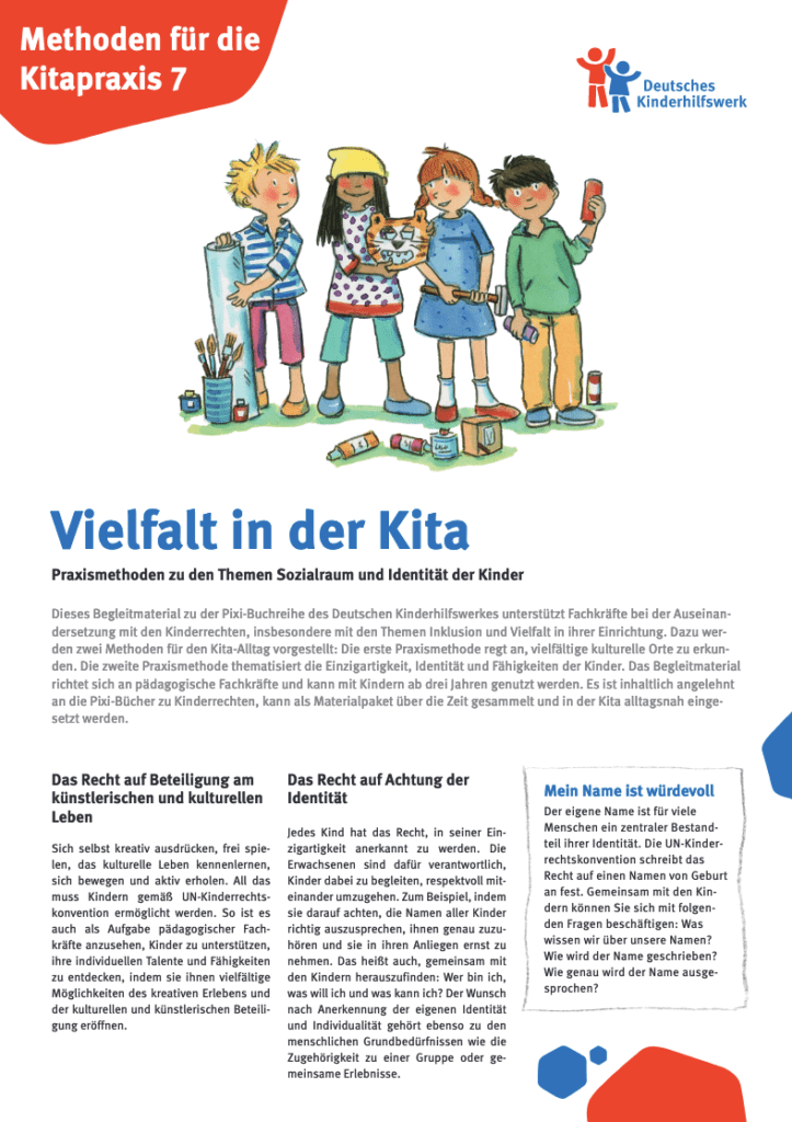 Das Begleitmaterial „Vielfalt in der Kita – Methoden für die Kita-Praxis 7″ des Deutschen Kinderhilfswerks wurde zum PIXI-Buch „Kunst ist für alle da!“ entwickelt. Es unterstützt pädagogische Fachkräfte bei der Auseinandersetzung mit den Kinderrechten in der Kita. Dabei werden verschiedene praxisnahe Methoden für den Kita-Alltag vorgestellt und mit einzelnen Umsetzungsschritten aufbereitet. Das Begleitmaterial enthält zwei Anleitungen, um das Recht auf kulturelle Teilhabe und Bildung für Kinder begreifbar zu machen. „Vielfalt in der Kita – Methoden für die Kita-Praxis 7“ ist auch ohne das PIXI-Buch nutzbar.