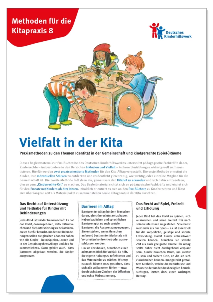 Das Begleitmaterial zum Pixi-Buch „Alle machen mit!“ unterstützt Fachkräfte bei der Vermittlung und Umsetzung von Kinderrechten, Inklusion und Vielfalt. Es geht um die Themen Identität in der Gemeinschaft und kindgerechte (Spiel-)Räume mit Übungen zum Entdecken der eigenen Stärken und zum Erkunden des Kitahofes für Kinder ab drei Jahren. „Vielfalt in der Kita – Methoden für die Kita-Praxis 8“ ist auch ohne das PIXI-Buch nutzbar.